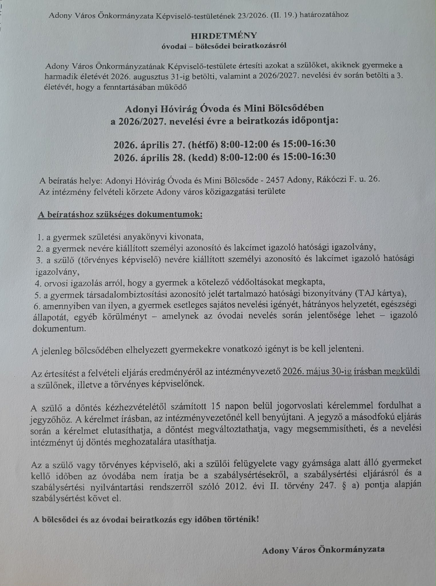 Óvodai - bölcsődei beiratkozás 2026.